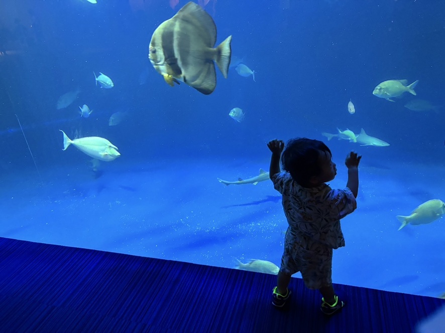 四国水族館で大型の水槽を目の前に大興奮の息子でしたが下から大きなエイが上がってきたら尻もちついて泣きべそ(笑)いい経験ですね♩Part2