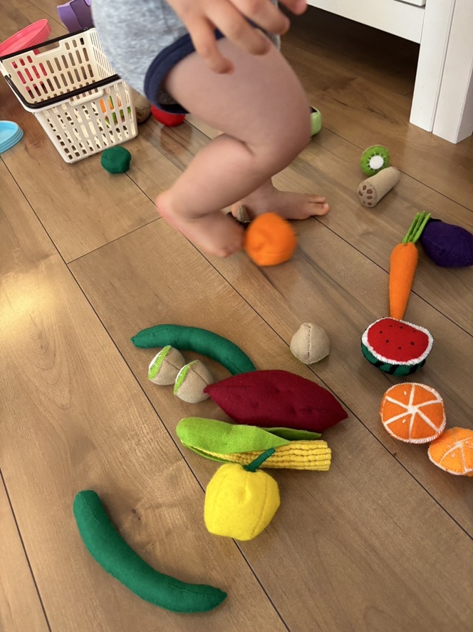 息子のハーフバースデー用にチクチク作ってたフェルトのお野菜と果物をようやく解禁してお買い物ごっこをしてます(笑)頑張ってよかった(笑)2025-07-15