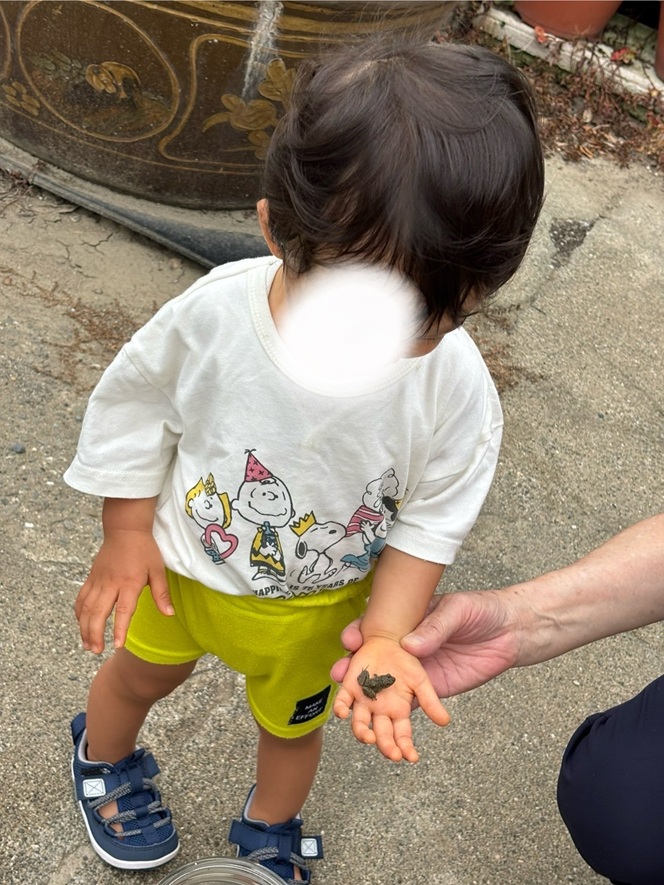 稲刈り終わってから妹が息子のためにカエル捕まえてくれてたのでお昼終わってからカエルとふれあい体験をさせましたっ☆2025-09-27
