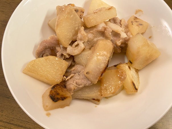 10分漬け込んでるから豚こまにしっかり味が染み込んで大根も少し焦げ目付けてるから