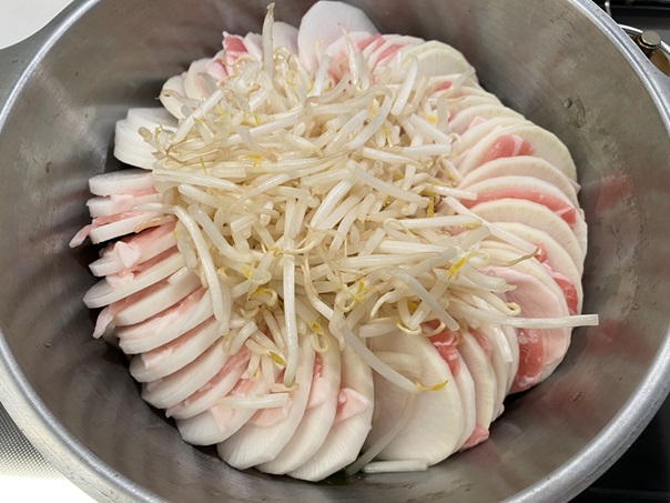 水は入れずに酒で酒蒸しにして真ん中にネギともやしも入れて味を凝縮
