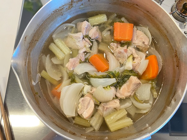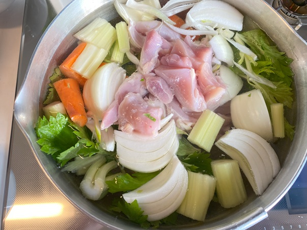 昆布出汁1Lににんじん、玉ねぎ、セロリ、鶏もも肉を2時間くらいコトコト煮込みます