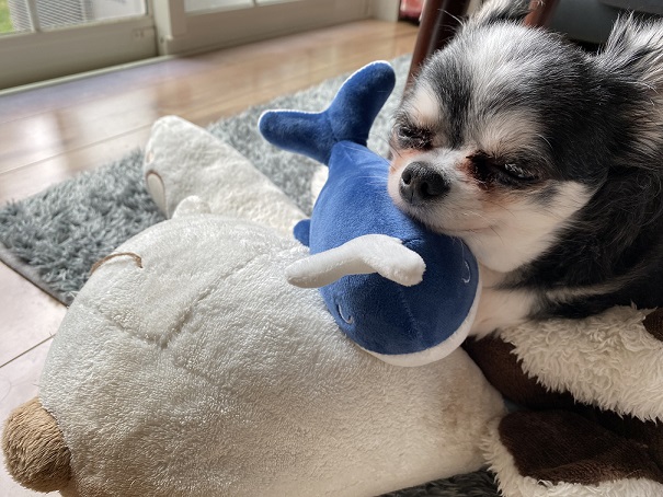 最近のお気に入りはお犬さんのお友達と一緒に寝ることが