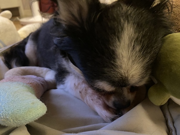 最近のお犬さん 寝る時はワニさんと大好きなおもちゃと一緒に寝てかんわいいね~♡2022-09-05