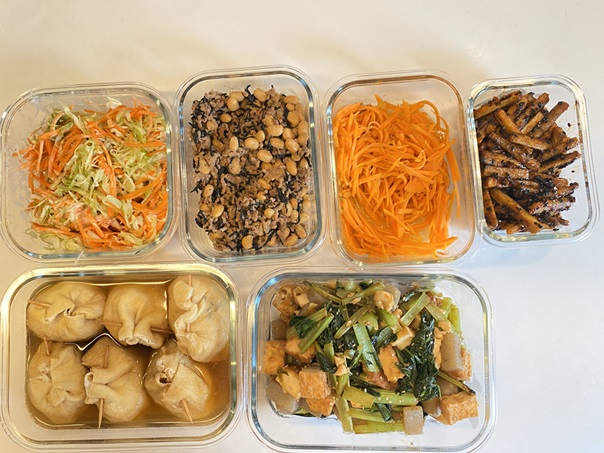 左上から)コールスロー、大豆とひじきのそぼろ煮、美容にんじん、ヤンニョムごぼう