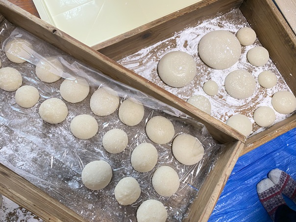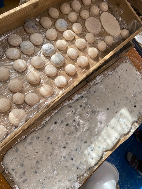 俵餅は俵に切り分けた餅と丸く丸めた2種類作ったんやけど丸いのは