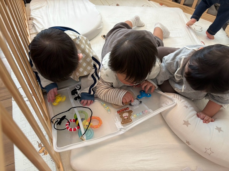 女の子ベビたちがぐずってたからビジーバッグで遊ばせてたら