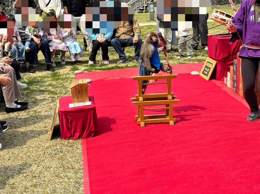 伝統芸能の猿回しが始まって武者行進隊は足を止めて