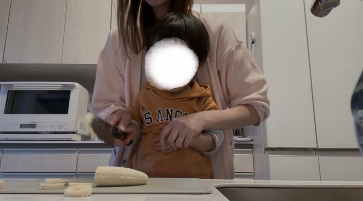 笑顔が戻ってニコニコ楽しそうにバナナを一緒に切って
