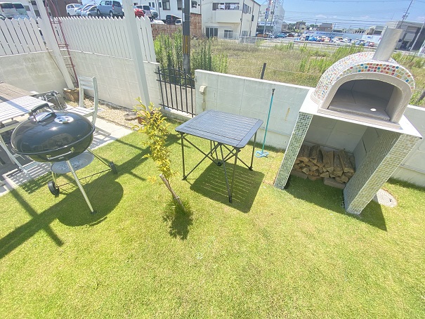 庭の芝生の緑とBBQの黒のグリルがほんとに夏感を