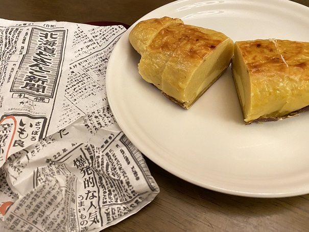 北海道どさんこ新聞に包まれたスイートポテトが