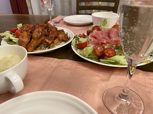 事前に冷凍してあったお肉とスープ、その日に作ったサラダでクリスマス感出しました