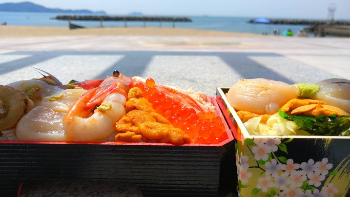 海をバックにちょっと豪華な海鮮丼