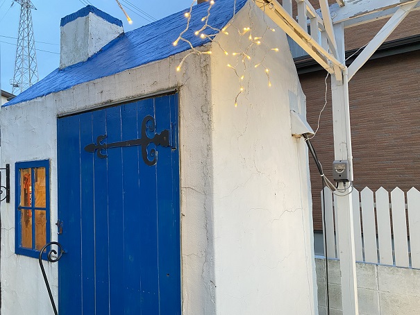 夕暮れになって倉庫の明かりとお庭のイルミネーションが点いたら