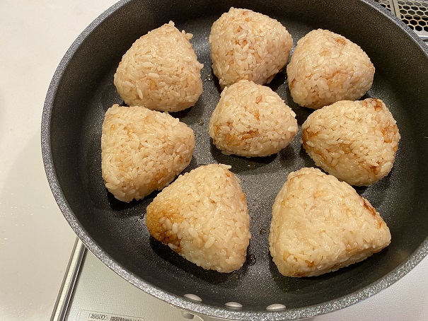 ごま油を敷いて熱したフライパンに三角おにぎりを並べて