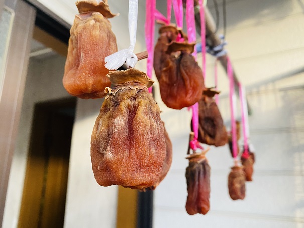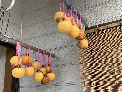 実家の洗濯物と一緒に干されてた柿がめっちゃしぼんで干し柿になってました!!2022-12-21