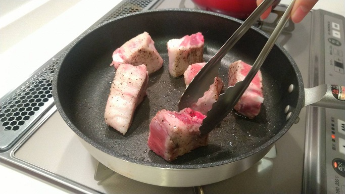 塩コショウを多い目になじませて焼いていくんですが先に焼いとくことでほろほろに仕上がるそうです