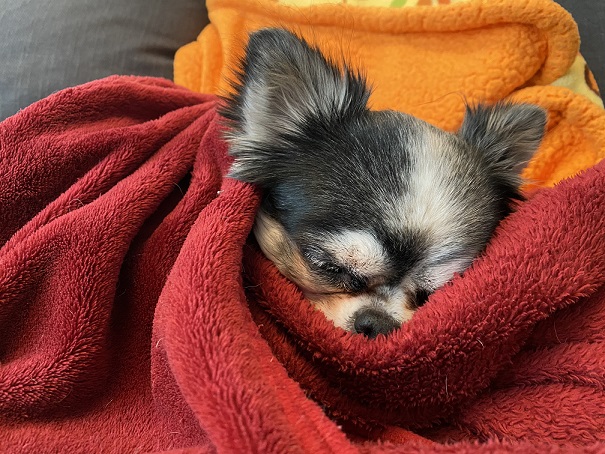 最近のお犬さん 寒い時はブランケットにくるまって縮こまってるお犬さんが可愛すぎる件♪2023-01-16