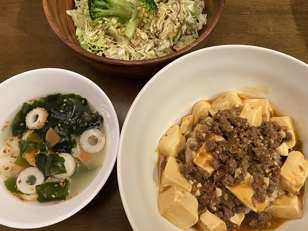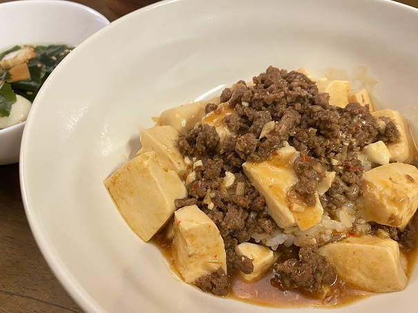 おうちごはん 最近ハマってる麻婆丼とわかめとお餅の中華スープ!簡単で尚且つ美味しくできます♪2023-02-01