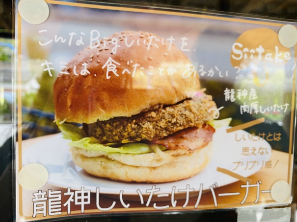 ちょうどお昼ご飯時だったので龍神の名物”シイタケバーガー”を食べよう!思って