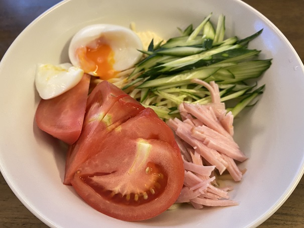 中華麺、ハム、キュウリ、たまご、トマト