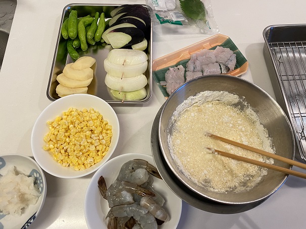 これ第一弾でシシトウ、ナス、玉ねぎ、ジャガイモ、エビ、鱧なんですが
