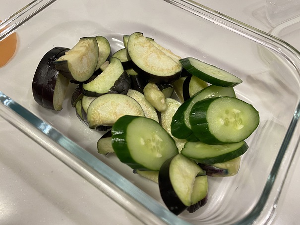 夜にキュウリ1本、ナス半本を漬けて冷蔵庫入れて夕方に冷蔵庫から取り出して
