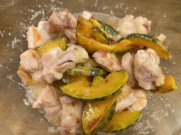 鶏肉を焼いて旨味たっぷりの油に好きな野菜を炒めます