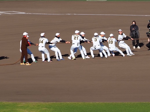 綱引き1回戦は選手たちが勝って2回戦はクリーンナップの大山、佐藤、森下が