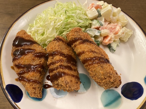しっかりパン粉を付けて揚げます