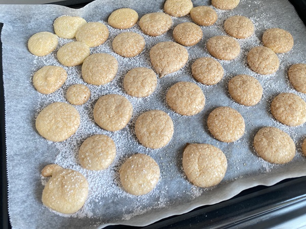 大量にかかりすぎてクッキングシート落ちた粉糖が少し焼かれてカラメルになっちゃうっていうね