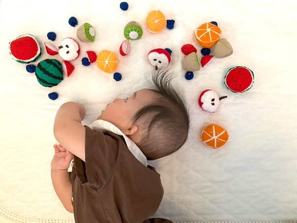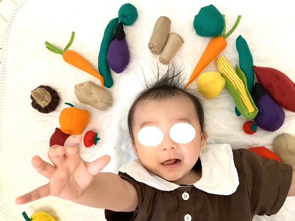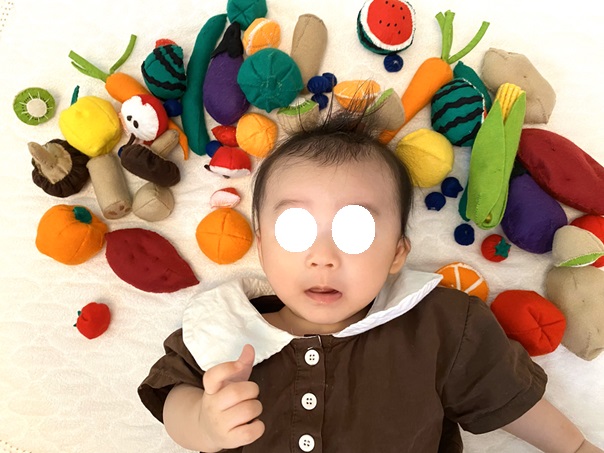 息子の6か月 ハーフバースデー用に作ってたフェルトのカットフルーツとお野菜を使って無事6か月を祝うことができました♪2024-10-13