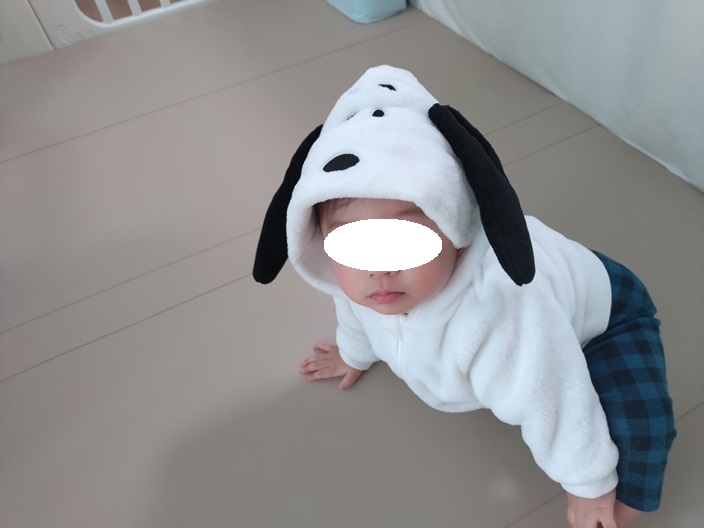 息子はスヌーピーのパーカーで