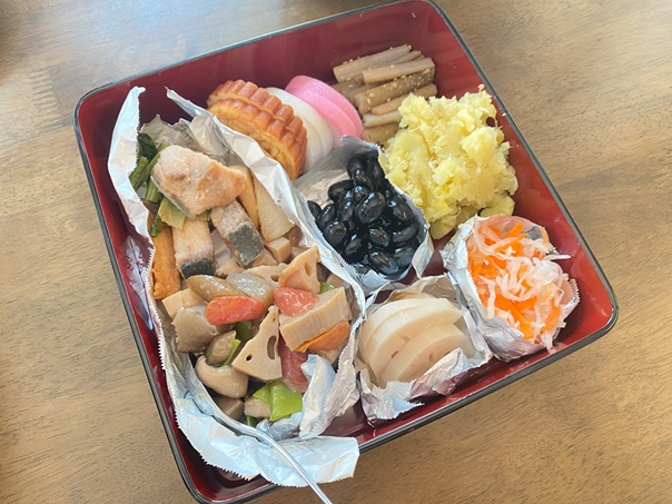 筑前煮、ブリの照り焼き、伊達巻、紅白かまぼこ、たたきごぼう、栗きんとん