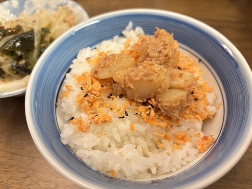 私は朝ごはんに自家製鮭フレークにニンニクの味噌漬けを