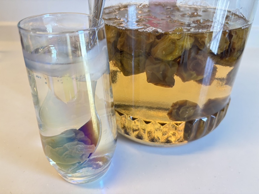 おうちカフェ しっかり氷砂糖が溶けて青梅がしぼんでしみしみになったのでようやく梅シロップを使って梅ジュースを作りましたっ♩2025-07-17