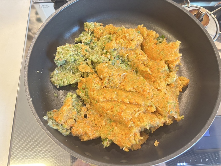 撹拌したらフライパンで野菜から出てくる水気がなくなるまで永遠に炒めていきますっ
