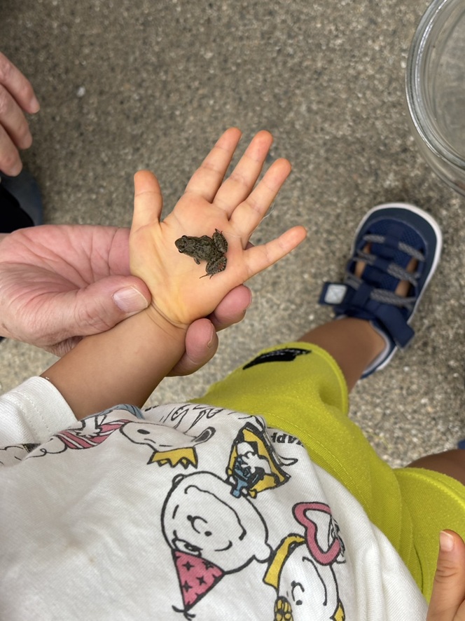 稲刈り終わってから妹が息子のためにカエル捕まえてくれてたのでお昼終わってからカエルとふれあい体験をさせましたっ☆2025-09-27