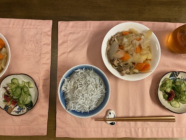 肉じゃが、シラスご飯、たことキュウリの酢の物