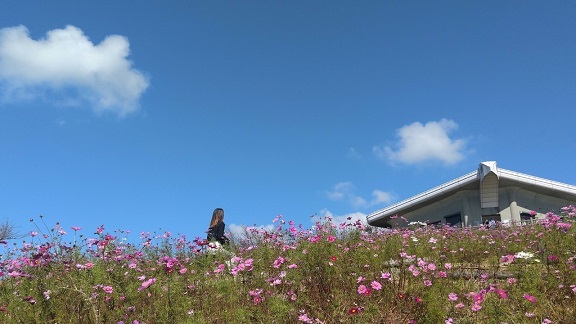 午後からちょっと曇ってきて雲の少ない晴れにコスモスを