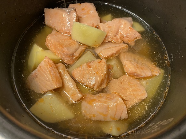 事前に焼いた鮭とジャガイモ、酒みりん醤油と2合分の水を入れて