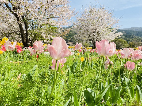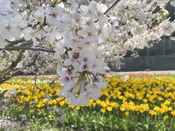 いろんな色のチューリップが咲いて桜もきれいに咲いて